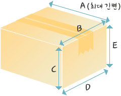 - 항공, 배편은 포장된 실무게적용 20kg 이하까지 배송 가능. - 가장 긴변 A의 길이가 105cm 이하 - 가장 긴변 A의 길이 + 나머지 네변(B+C+D+E)의 길이가 200cm 이하까지 가능 (초과시 배송 불가)